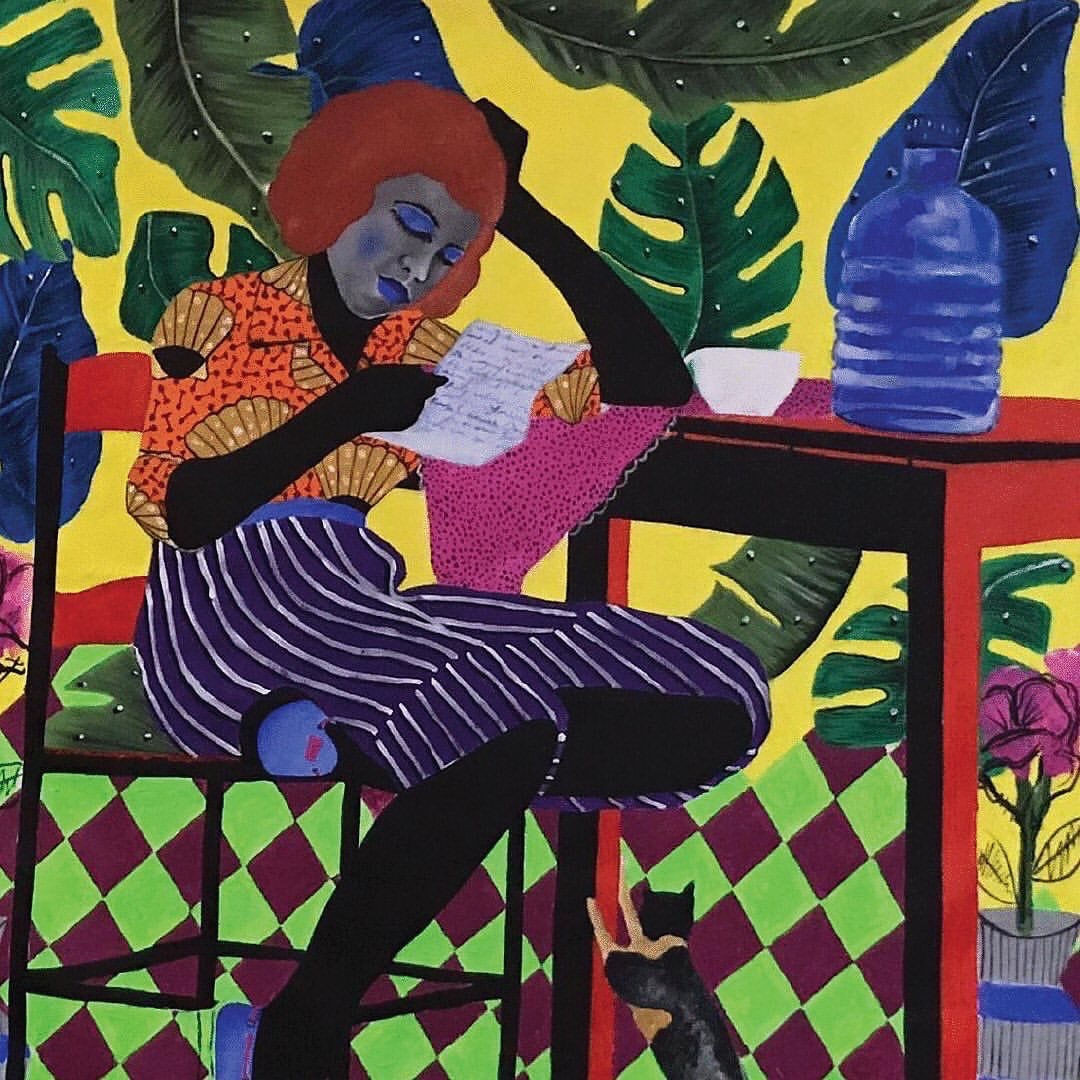 Osvaldo Ferreira was born and lives in Angola. He is one of the first artists to obtain higher education in the arts within the Angolan territory. His work, mostly painting, focuses on exploring themes of everyday life in Angolan society and expresses the intergenerational continuous/ discontinuous relationship within social experiences. The artist frequently integrates elements that chromatically and materially reference the African textile tradition of exuberant colours. The artist uses his mediums to emphasize further the presence of the cultural and social heritage of a continent that has witnessed successive processes of cultural appropriation and manipulation through colonization and globalization and the subsequent triggering of involuntary miscegenation and imposition of a degenerative system of their identity.
