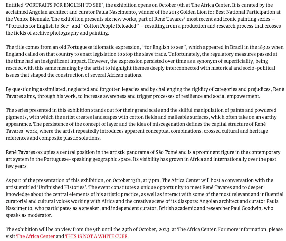Portraits for English to See: THIS IS NOT A WHITE CUBE in partnership with The Africa Center presents René Tavares